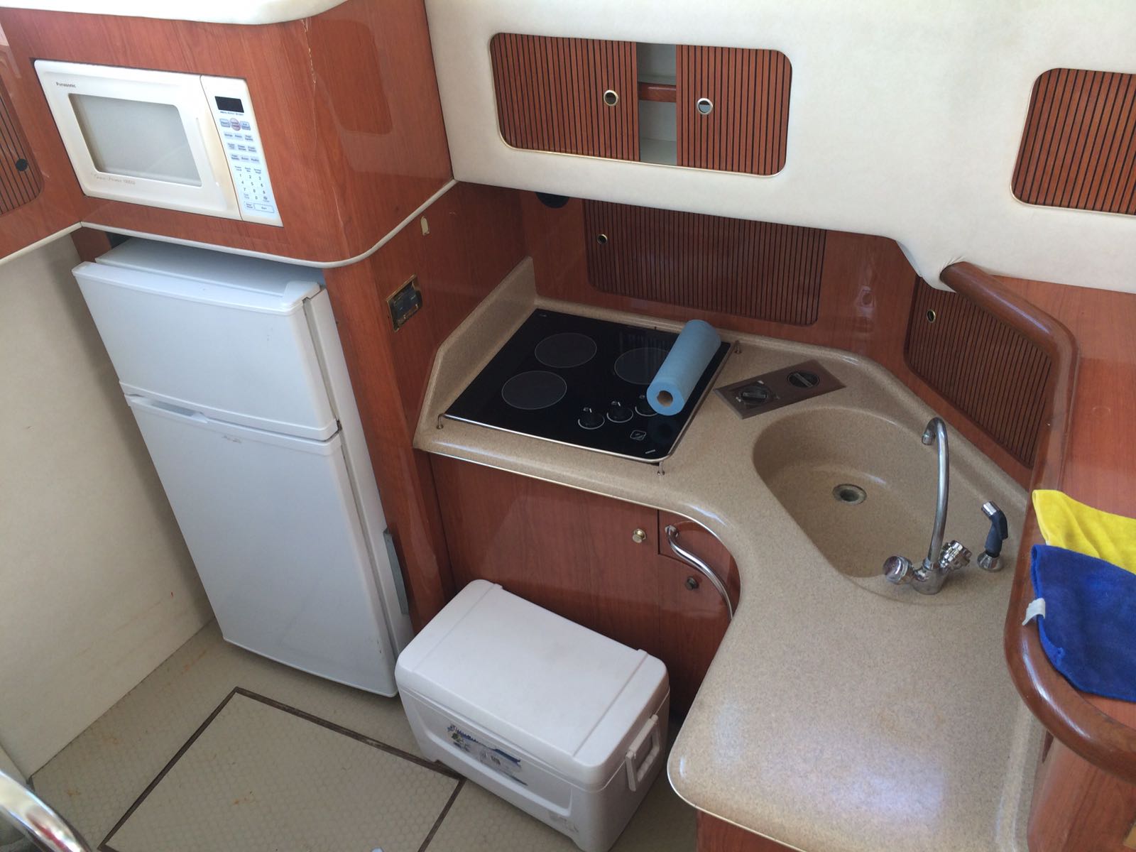 La galería tiene una cocineta con un refri bastante grande para un yate, una sala y un comedor.