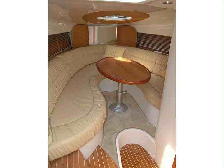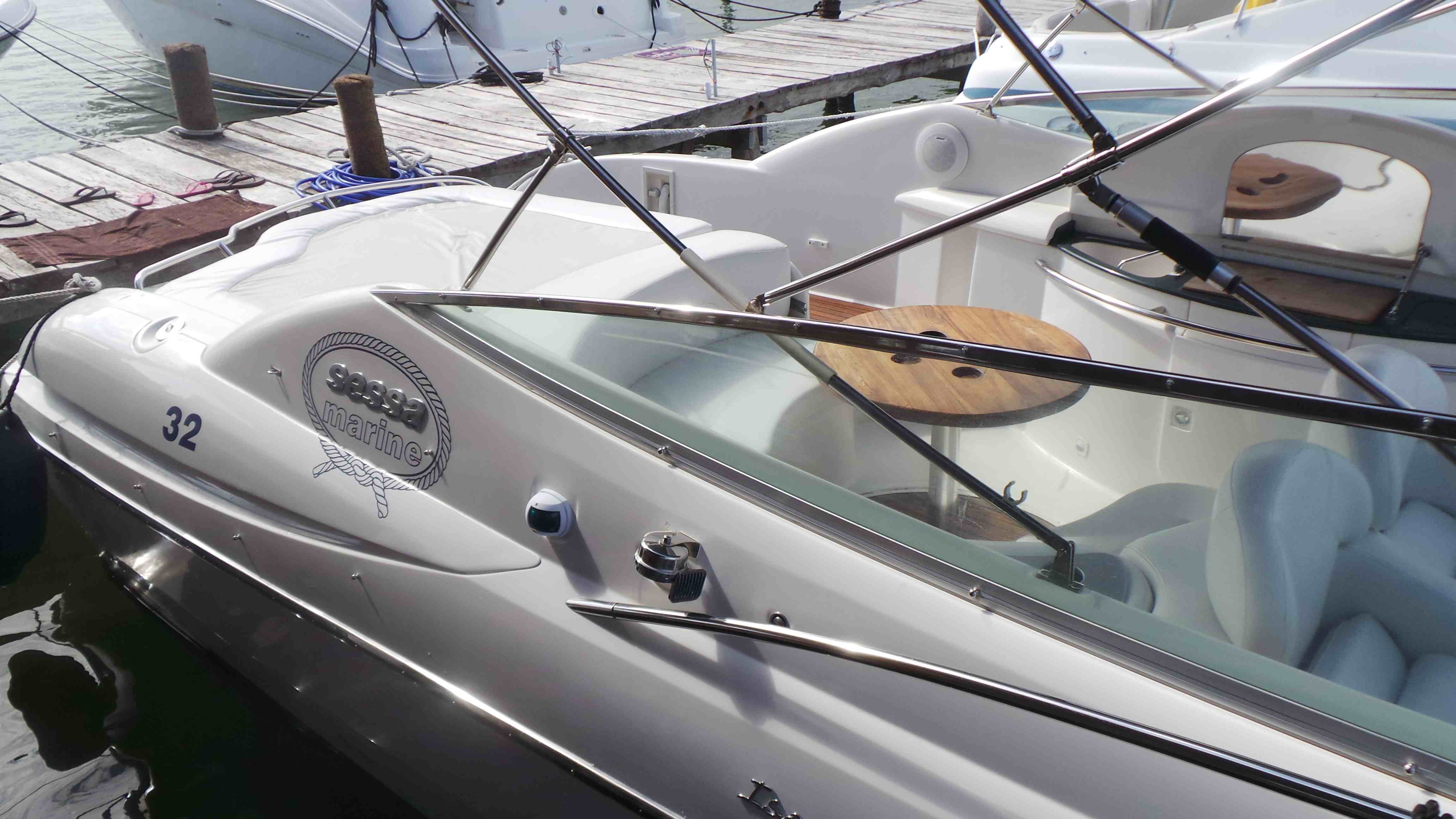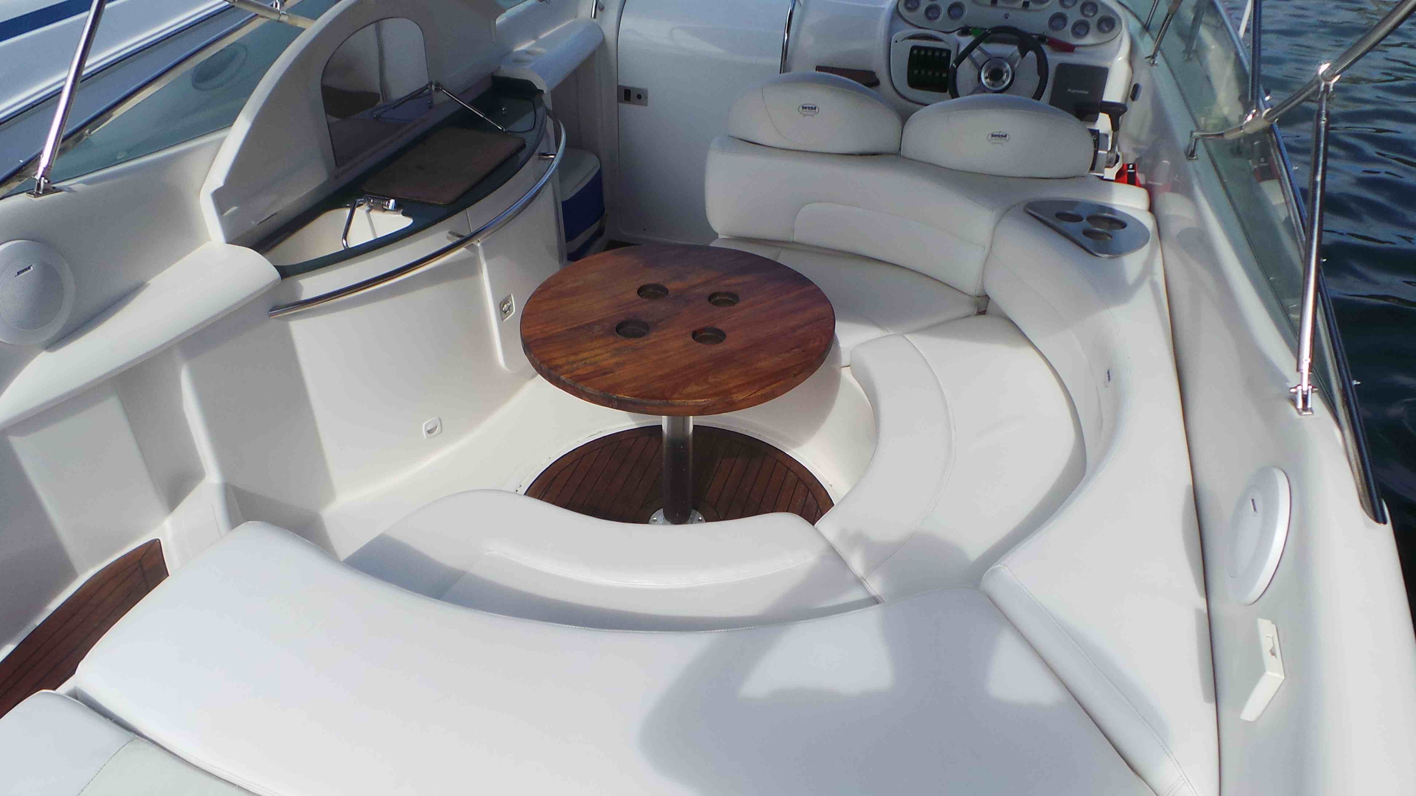 El Sessa cuenta con dos motores y una cabina con una cama matrimonial, una cocineta pequeña, una sala de media una y un baño completo. todo el interior cuenta con aire acondicionado.