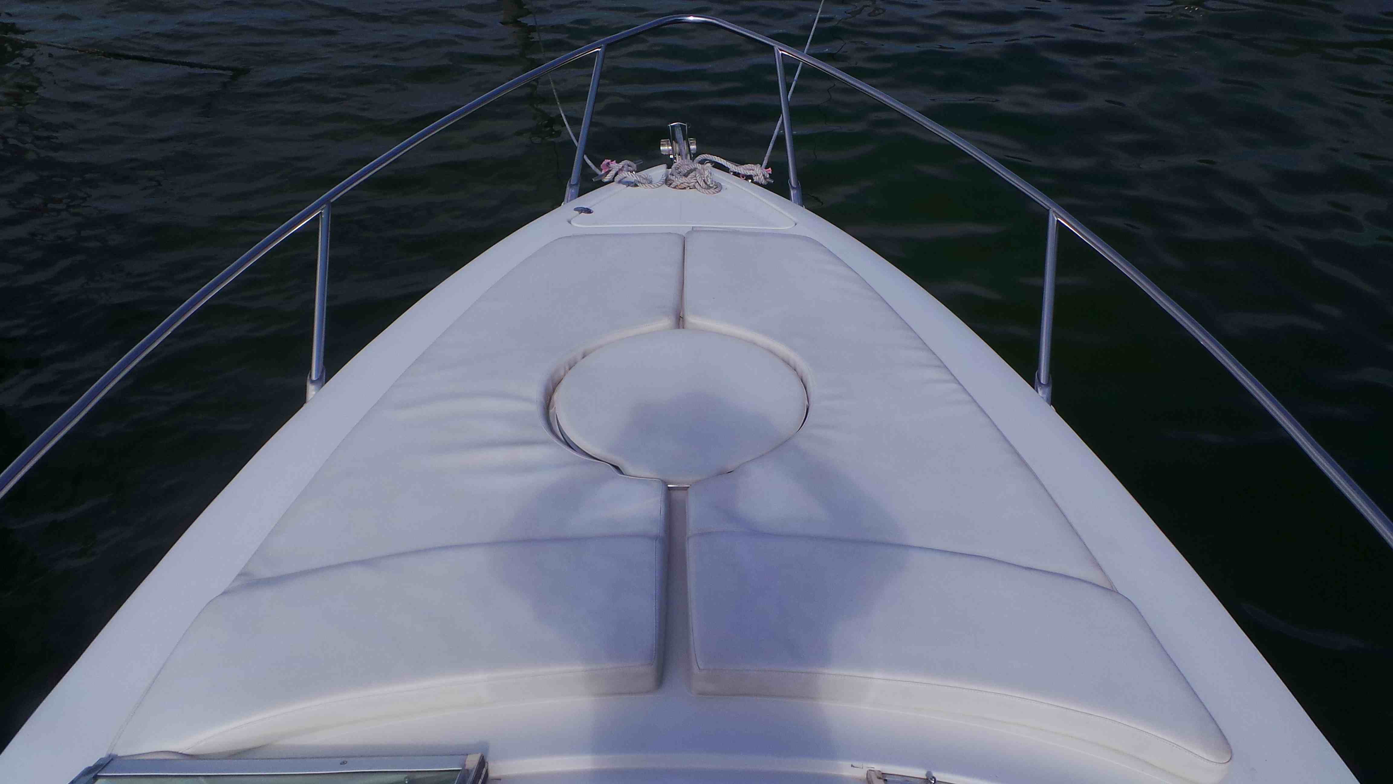 En la cubierta para su tamaño tiene mucho espacio para relajarse y disfrutar de su paseo pirvado en yate de lujo. en la popa que es la parte trasera del yate tiene una colchoneta de tamaño matrimonial para tomar el sol, y bajo la sombra cuent con comedor de media luna en frente con lava manos y una hielera. en la proa que es la parte delantera del yate cuenta con dos colchonetas individuales ideales para recostarse y relajarse en alta mar.