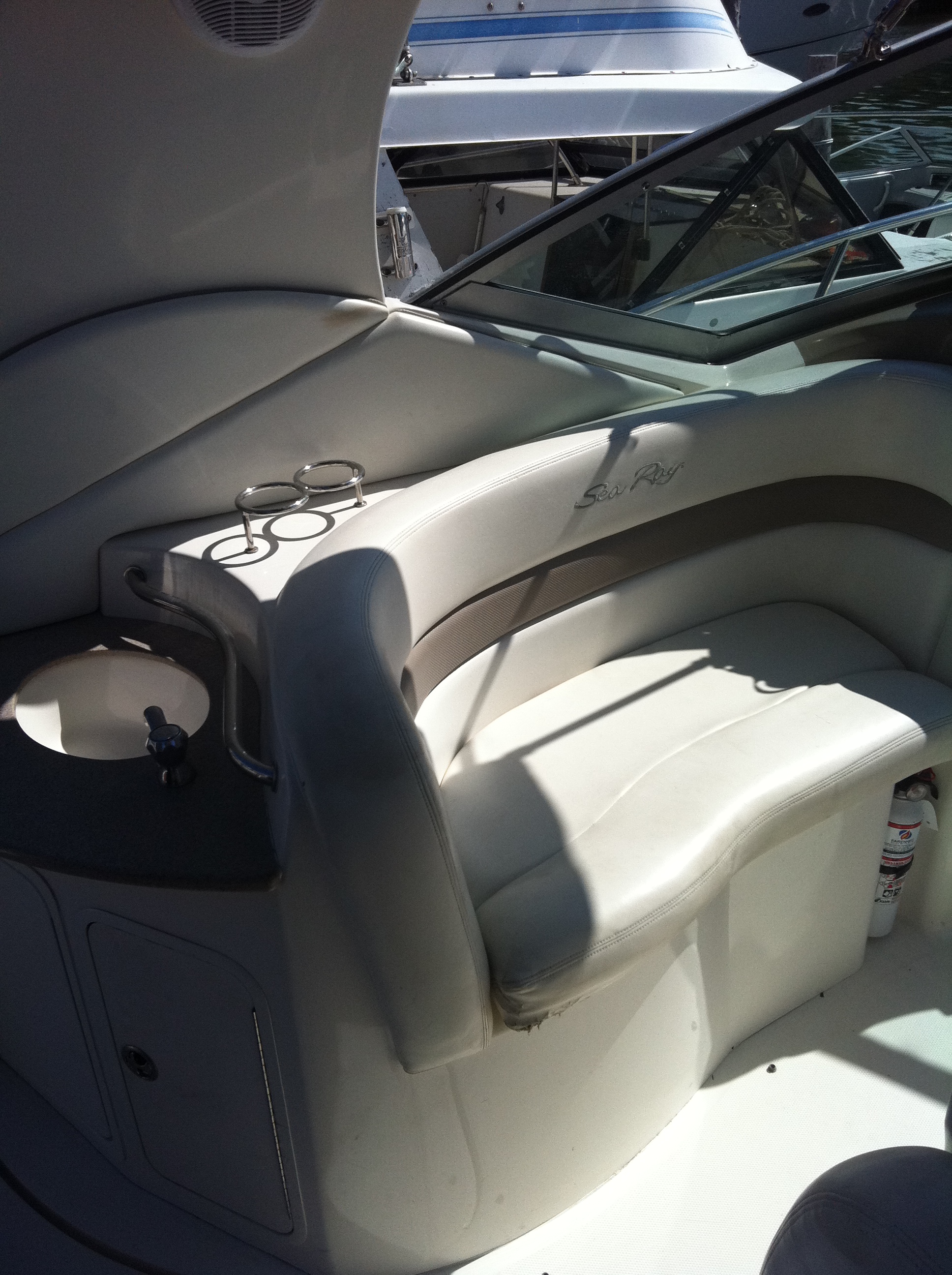 En su cubierta cuenta con otra sala de media luna bajo techo, con una mesa en el centro que hace la embarcación comoda para viajes dentro de la bahía de Cancún, Isla Mujeres y alrededores.
